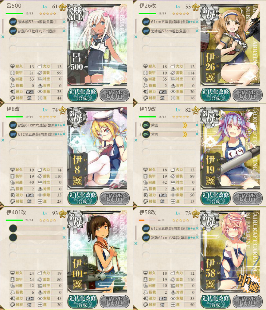 とりあえずこの状態のままで出撃させて索敵値が足りるかチェックした後、伊401に彩雲(輸送用分解済)を2個乗せて出撃