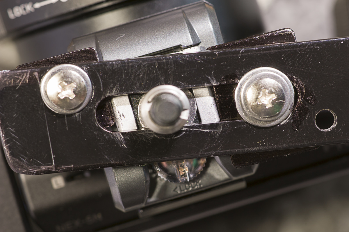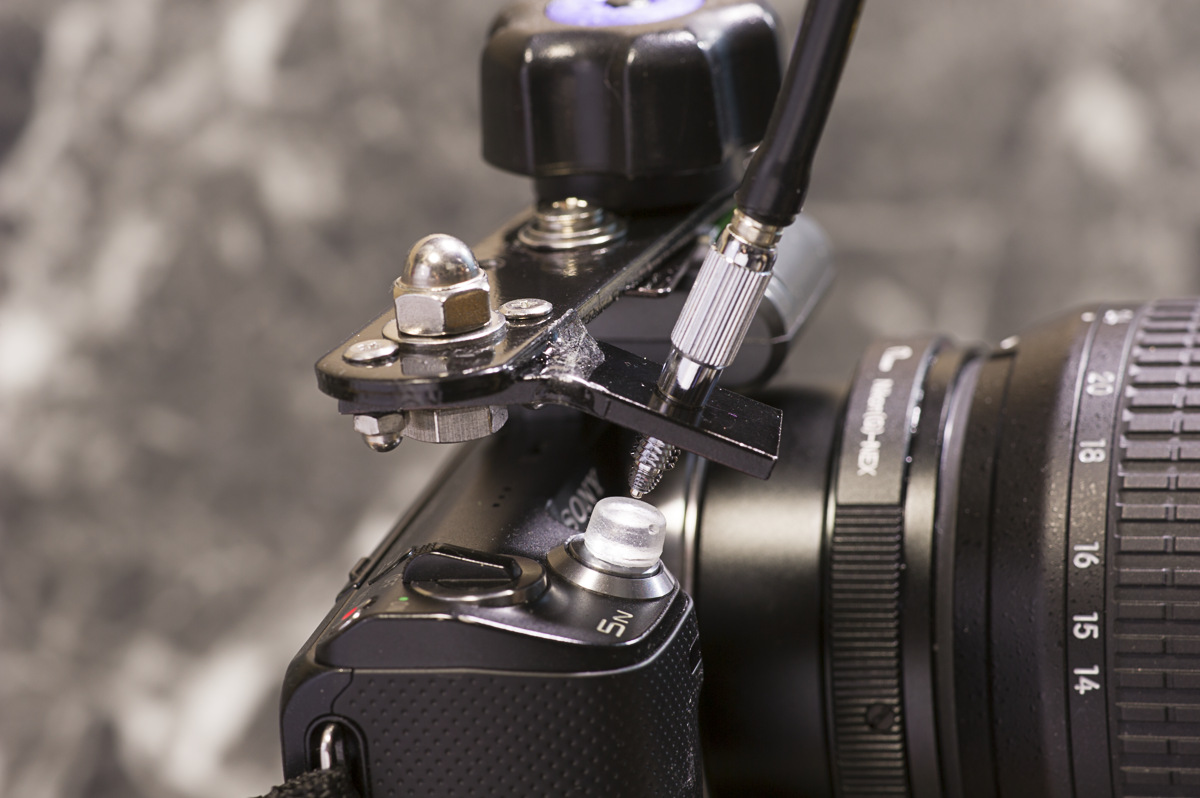 ほぼ固定ポジションとなるようにホットシューを左右で挟んでガイドとなるように金具をそれぞれ固定させました