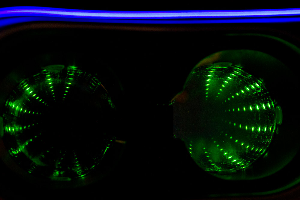 カップホルダーの底面に丸くくり抜いたミラー板を置いて緑色の側面発光LEDを下向きに固定してその上に丸くくり抜いたハーフミラーを乗せている