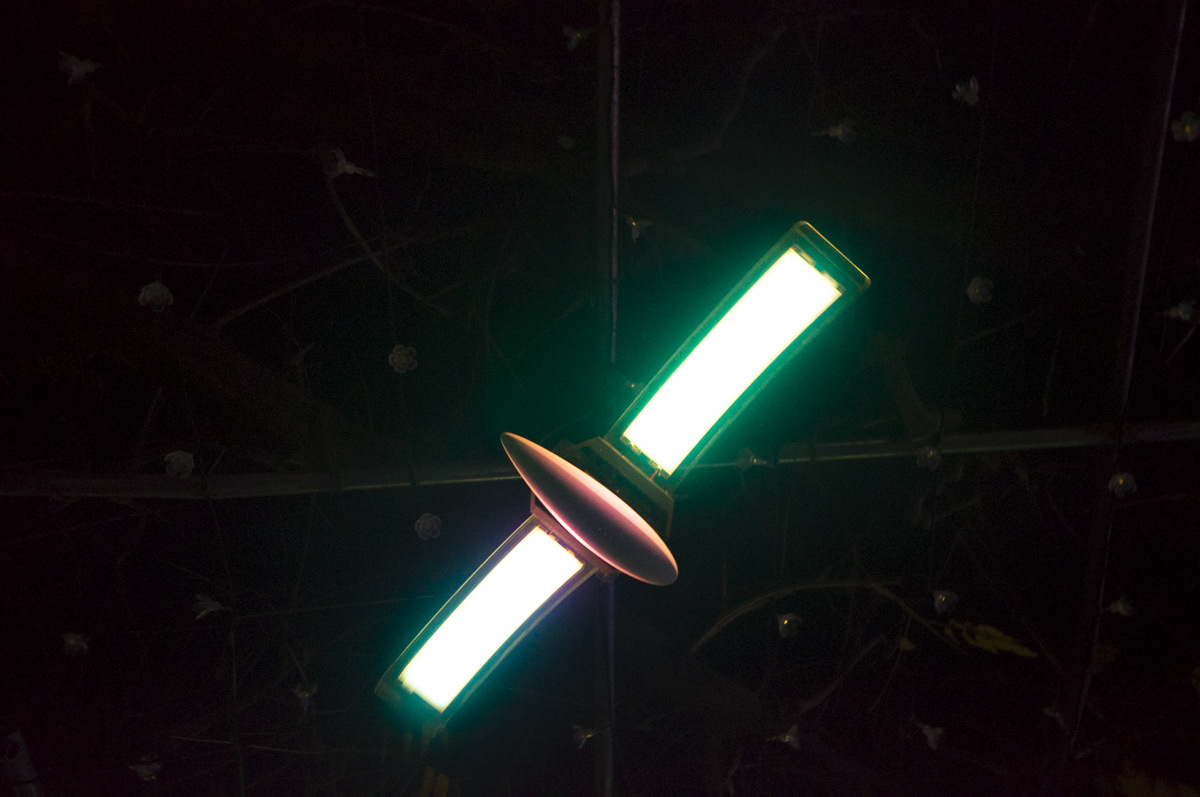 この鳥が有機 EL パネルを用いたイルミネーション。有機ELパネルの羽の色が変りパタパタ動きます