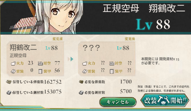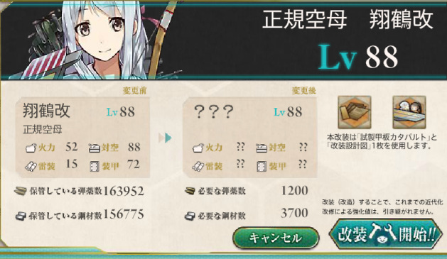 改二甲は88レベルで開発資材と弾薬・鋼材だけ消費
