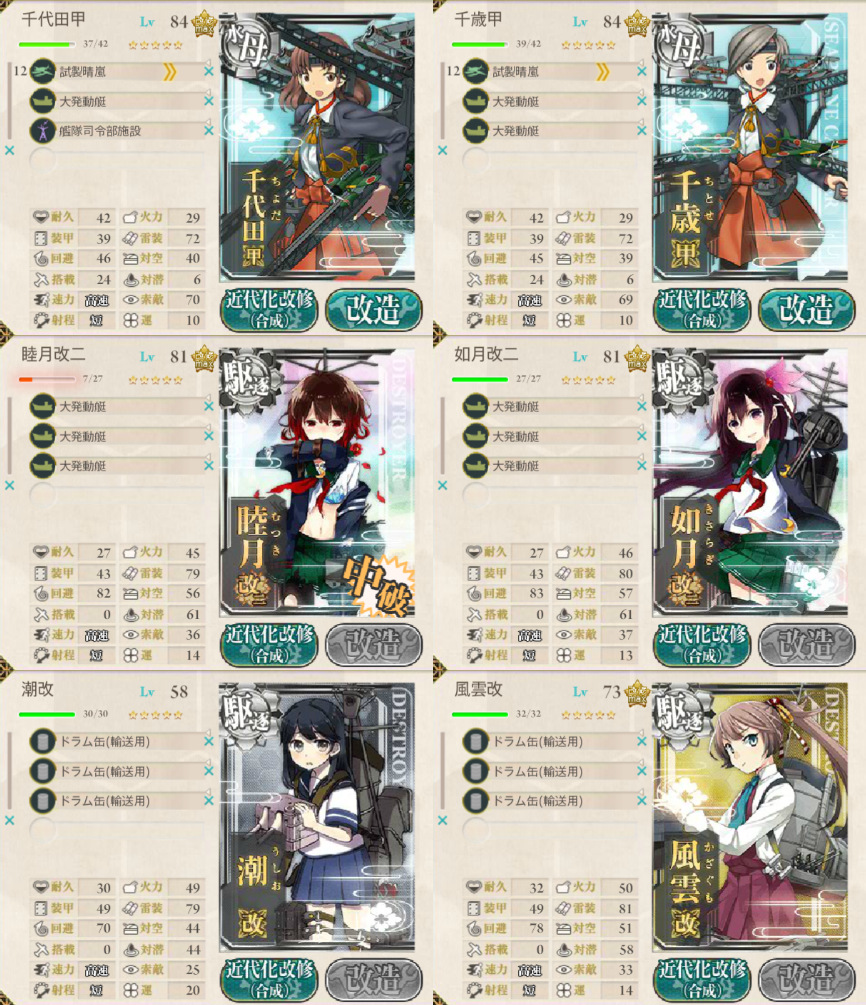 何度か出撃させて気がついたけど第二艦隊に瑞雲系装備させてても開幕爆撃に参加しないから意味ないっすね。っていうことで零観にしました