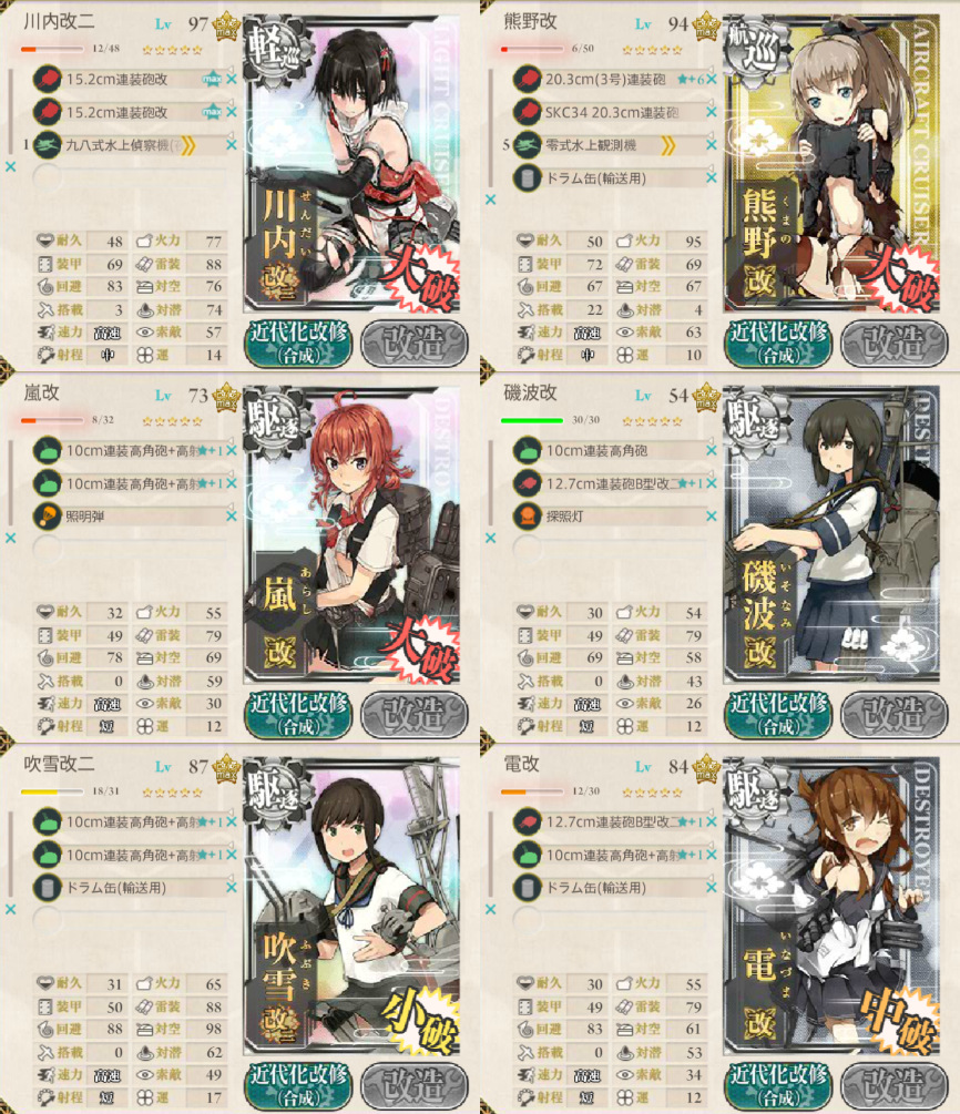 最初は鈴谷&熊野コンビだったんだが2人とも殆ど仕事しなかったので、鈴谷を外して駆逐艦増やしました。結局残った熊野も連撃しないしミスばっかりだった