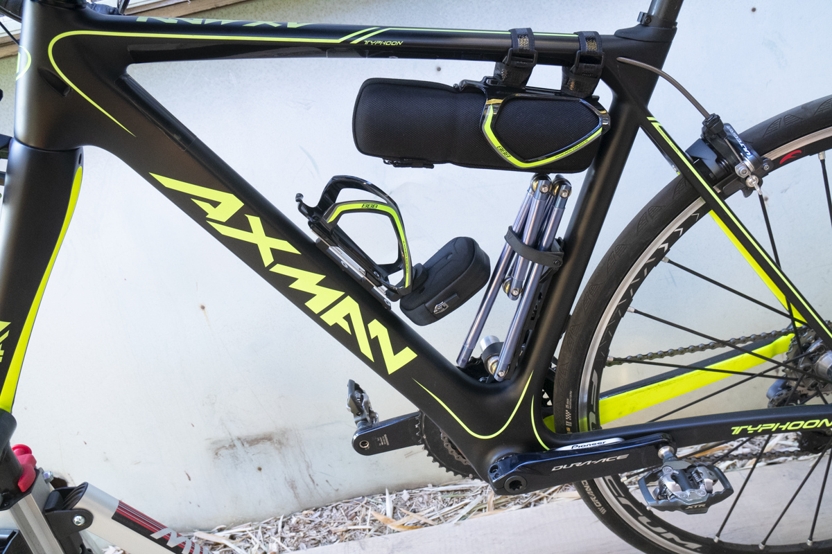 ボトルケージの位置を変えるブラケットを駆使して両方ともうまいこと収納されてはいるがごっちゃごっちゃ感は強い