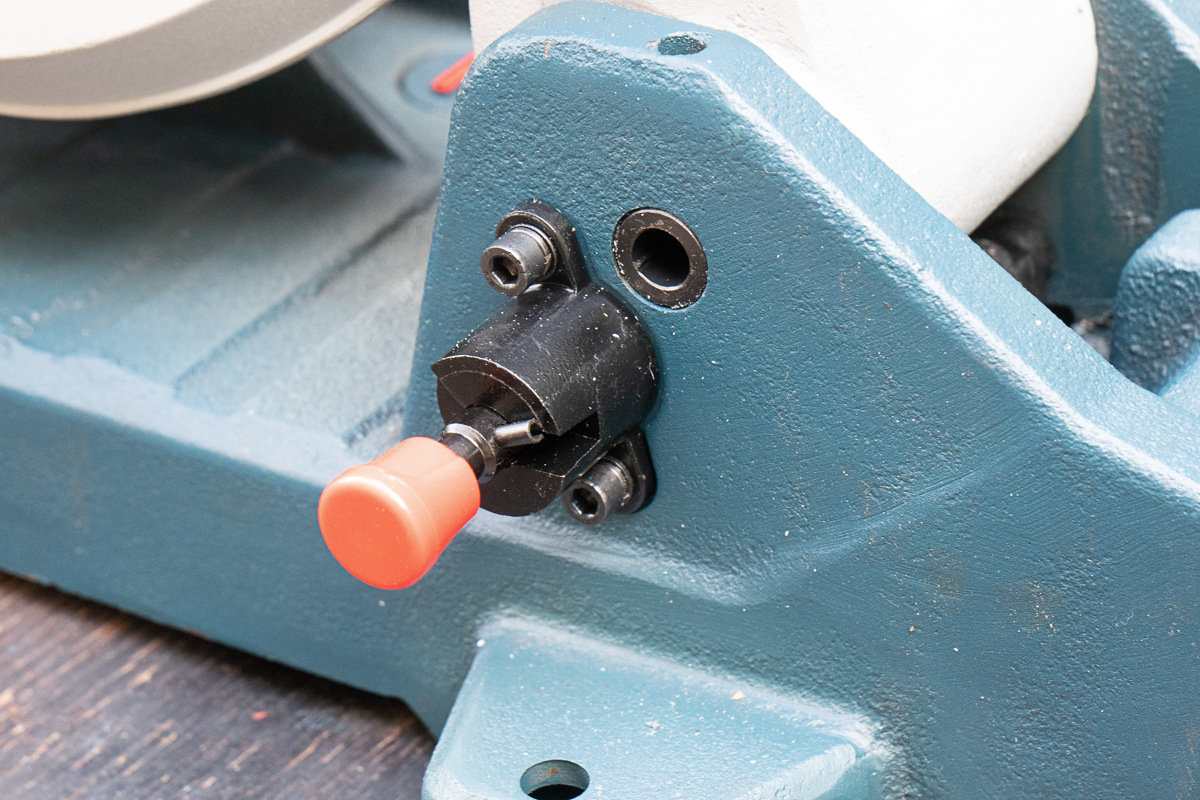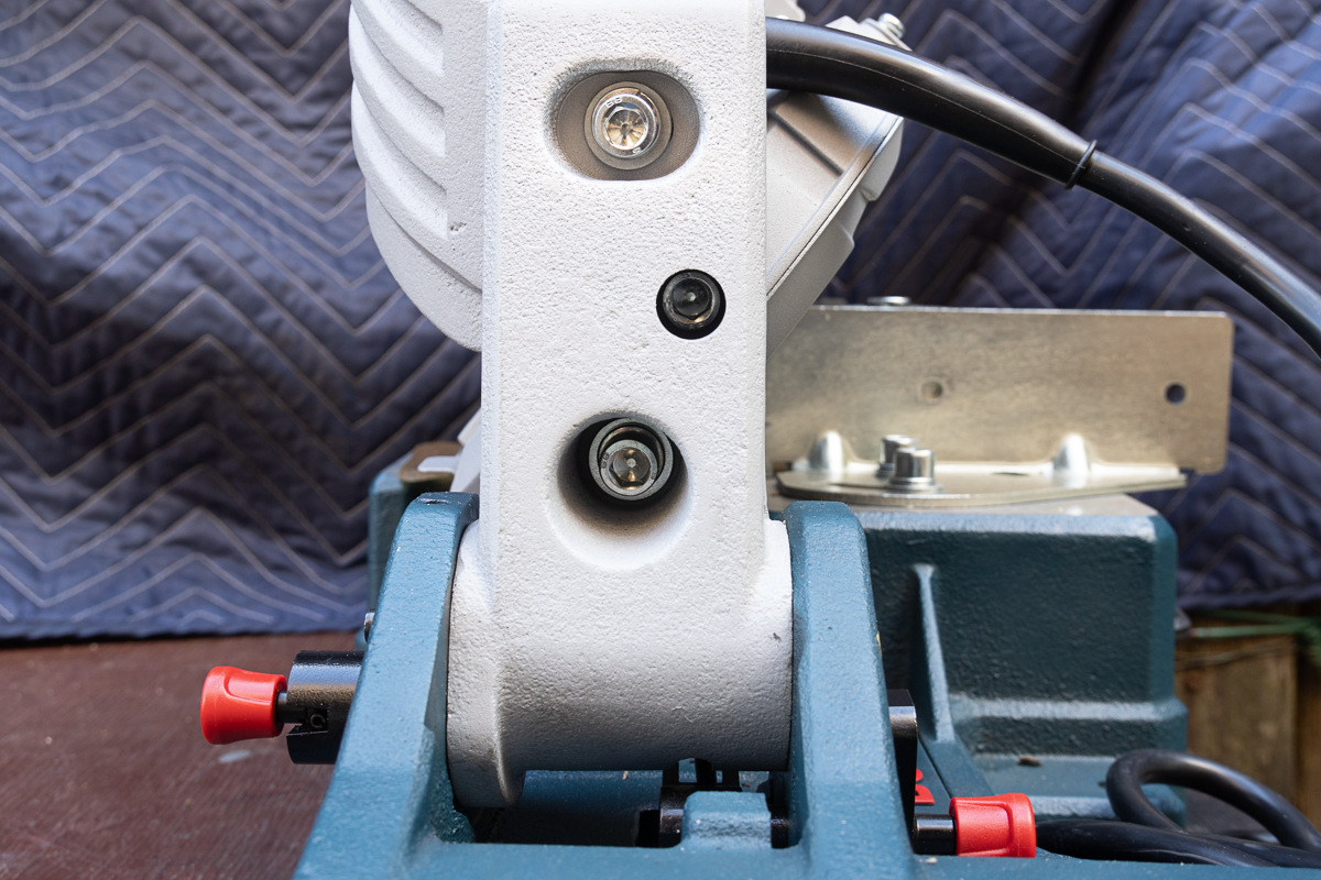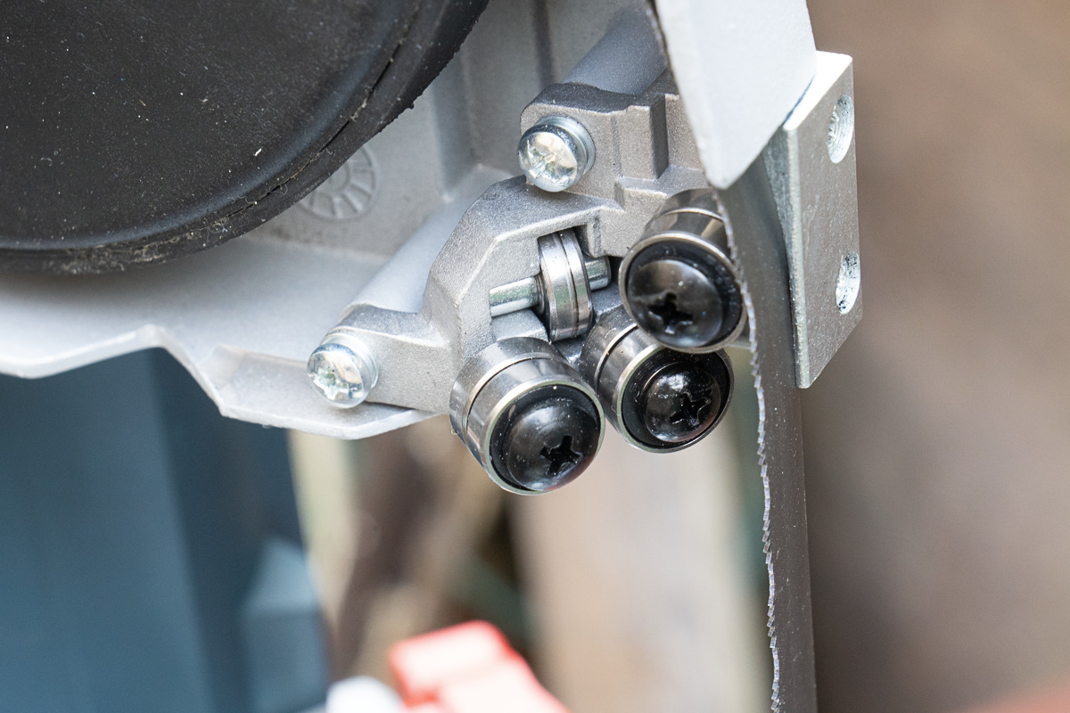 バンドソーの傾き調節のネジ(上と下)。中央のイモネジは調整とは違います