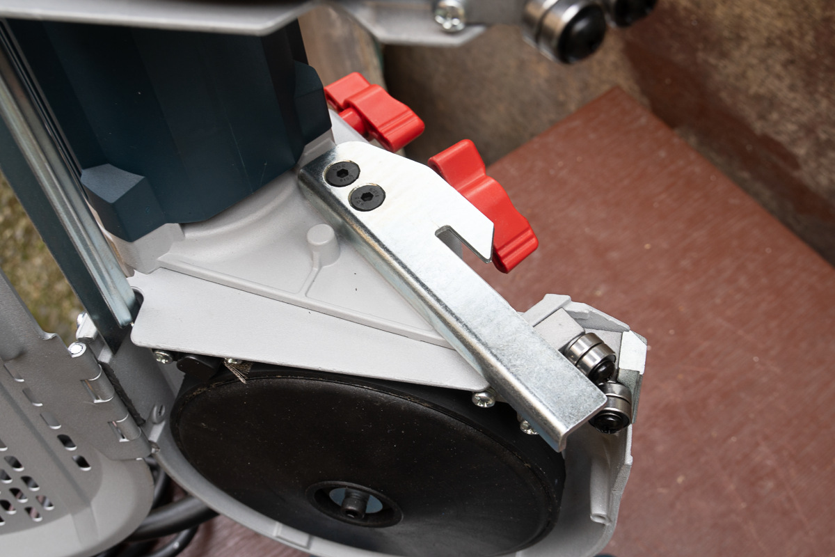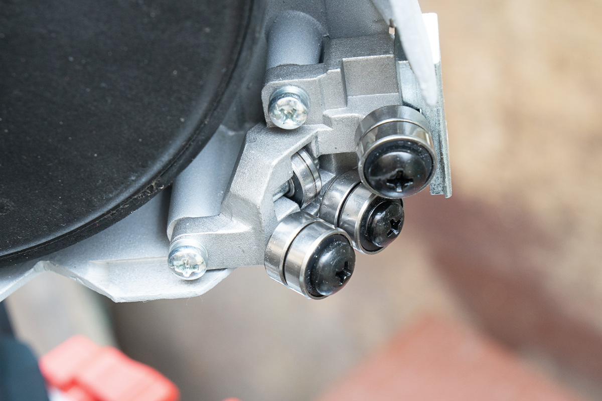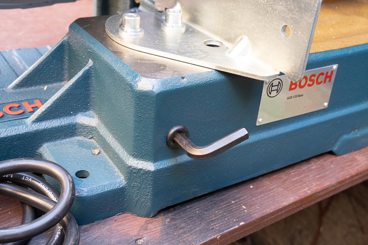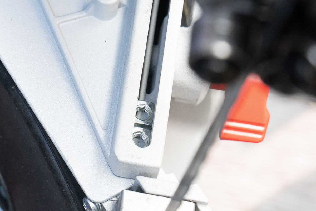 バンドソーの傾き調節のネジ(上と下)。中央のイモネジは調整とは違います