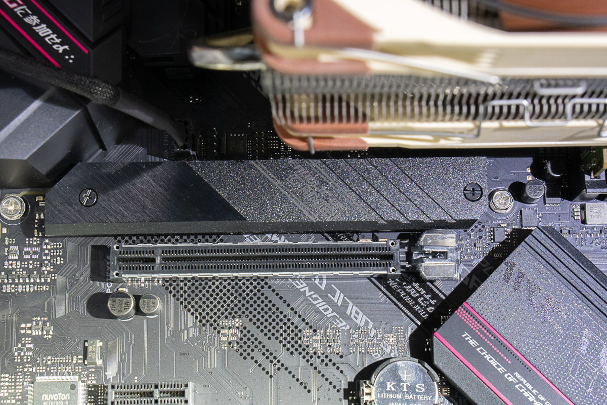 あと写真には写しませんでしたが、前述したとおり片面実装M.2SSDなのでマザーボード付属の四角い小さいゴムパッドを所定の位置へ1つ貼ることを忘れずに