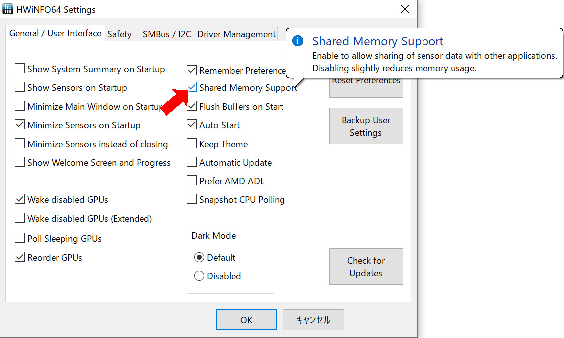 HWiNFO64のsettingsで「Shared Memory Support」にチェックを入れます