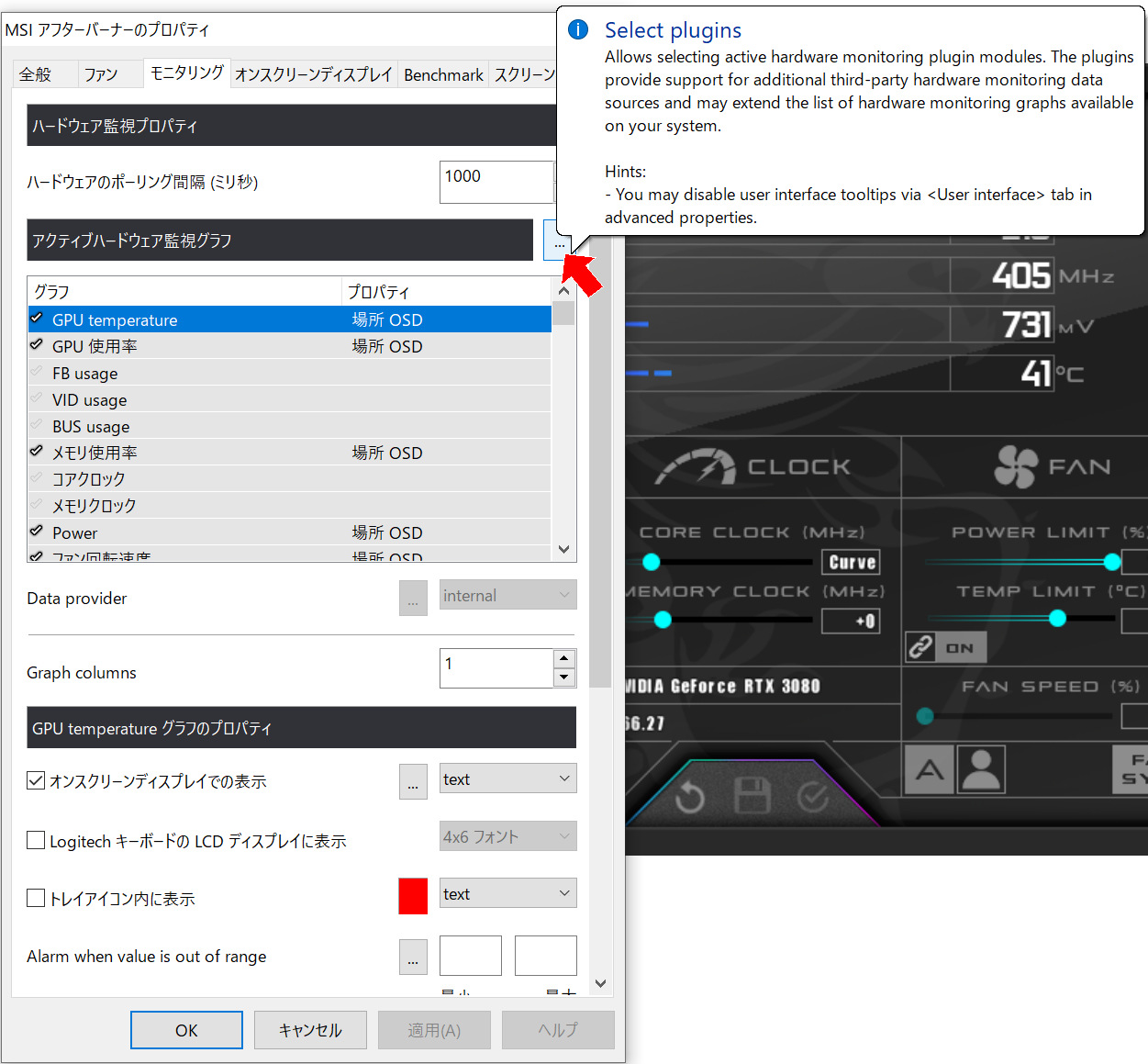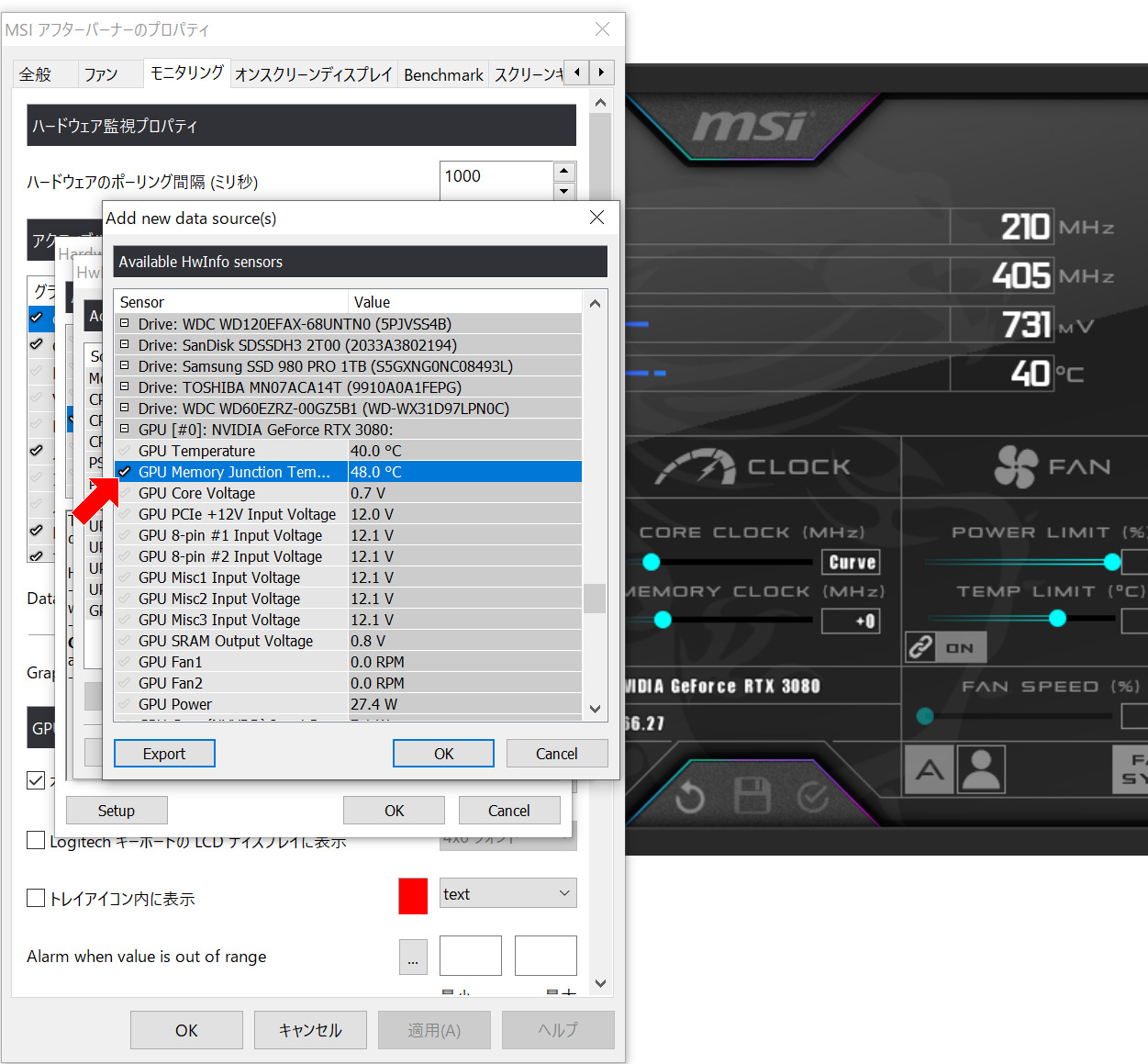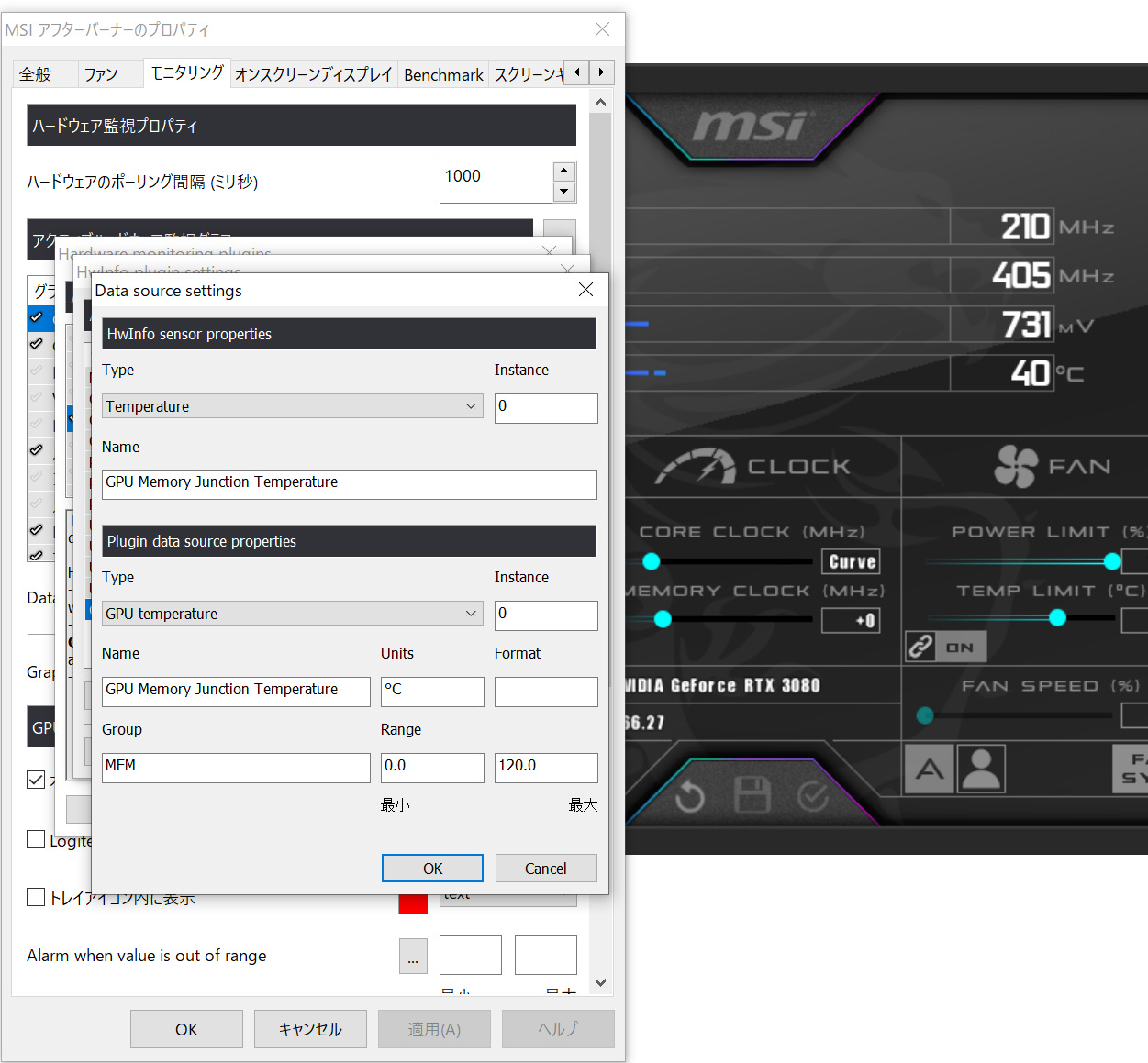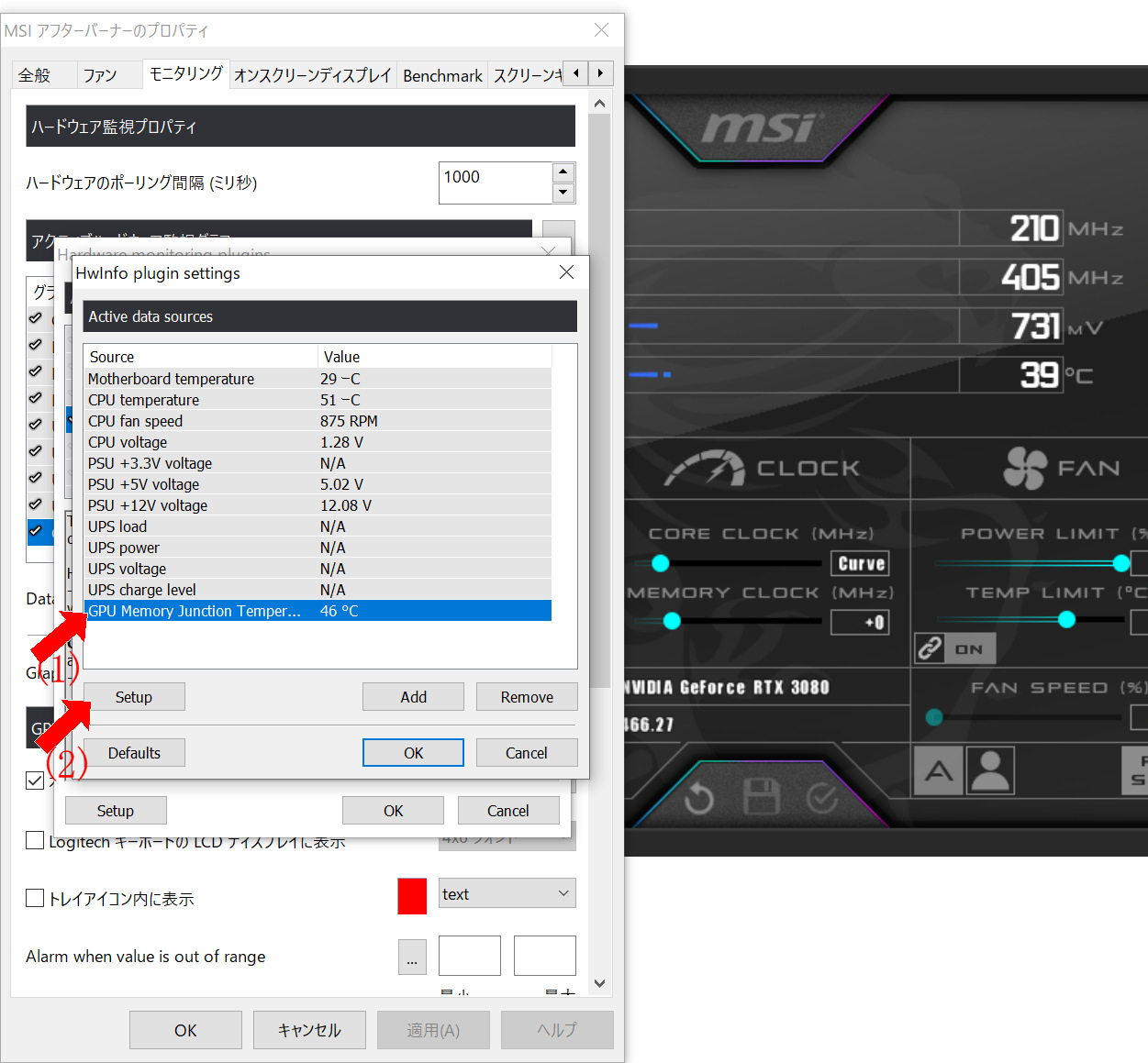 「AfterburnerでGPU温度を観測するには、HWiNFO64が別途要る」って事?