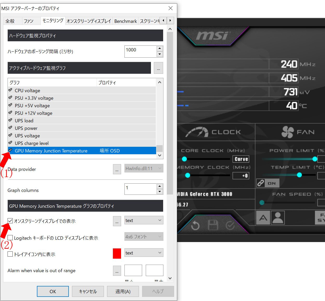 これでGPUメモリの温度(GPU Memory Junction Temperature)がOSD上に表示されるようになりました