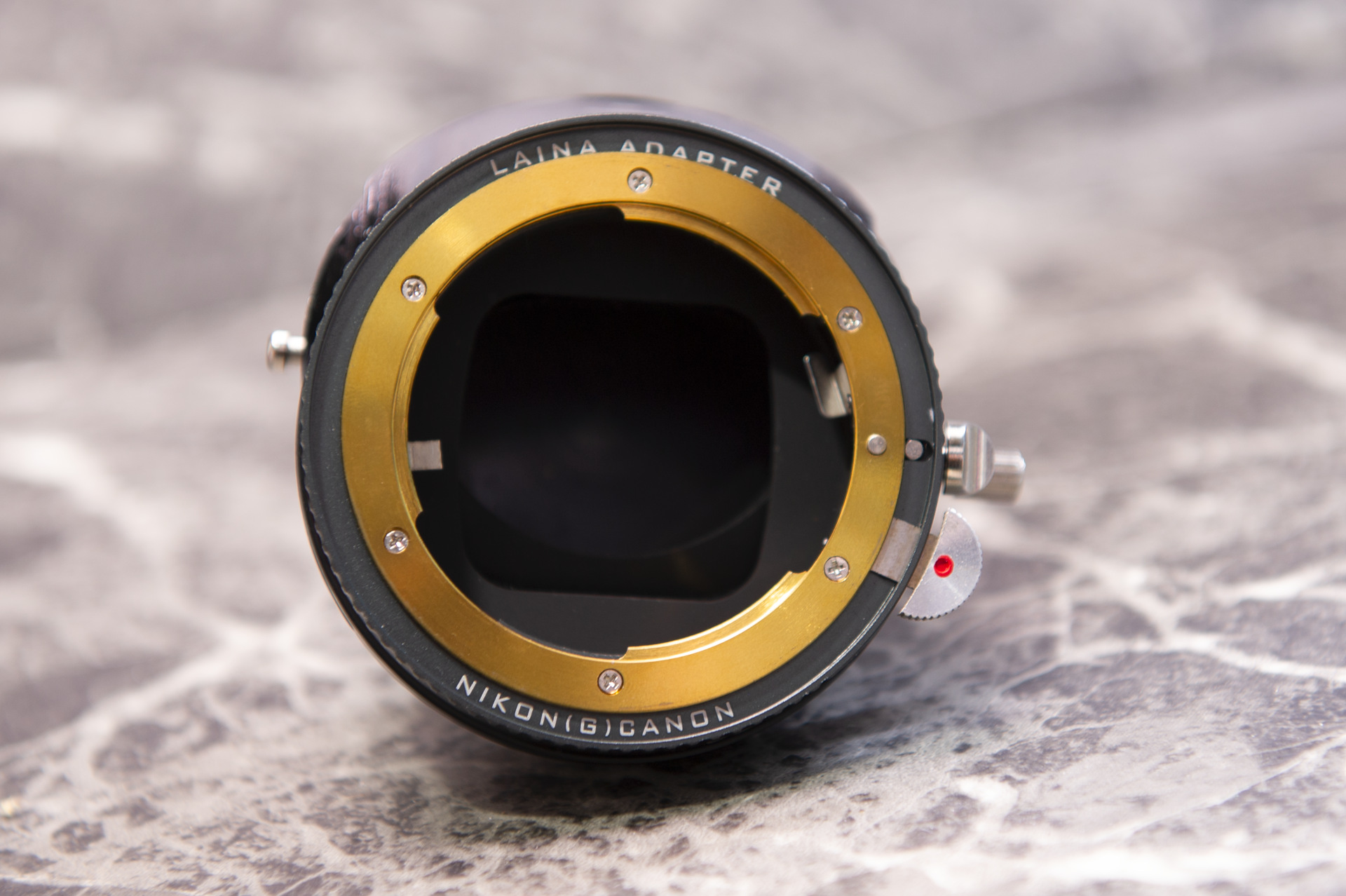 レンズ側は実はキヤノンEFマウントですが付属の金色アダプターでニコンFマウント化