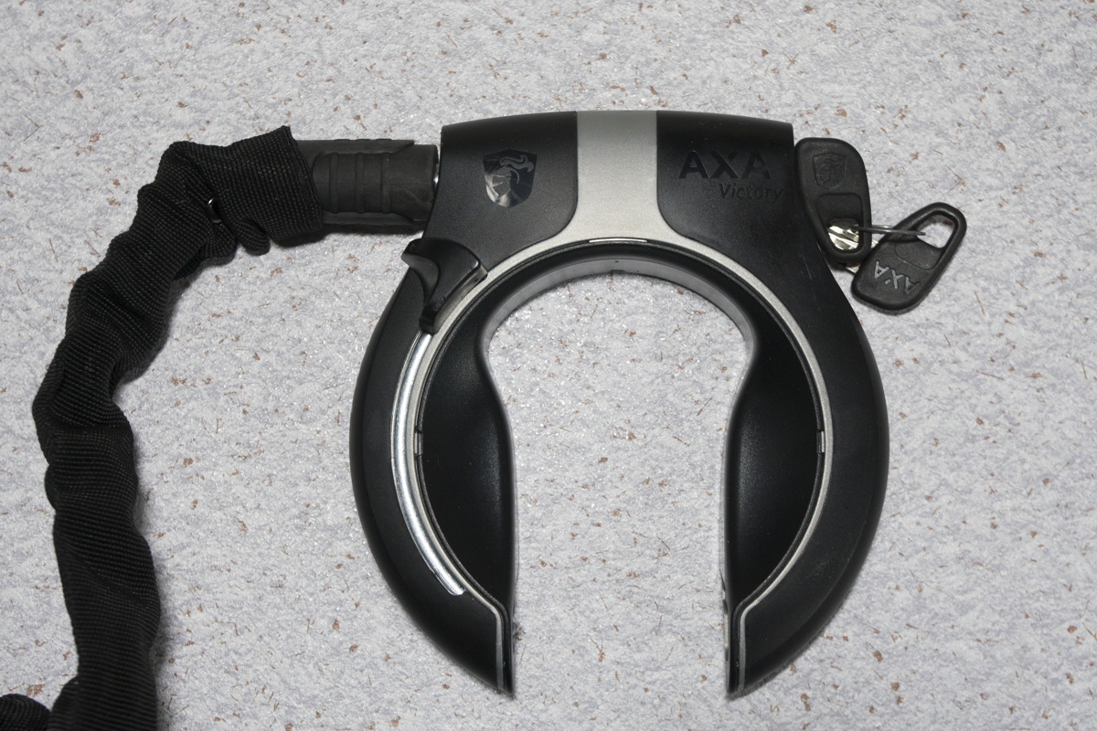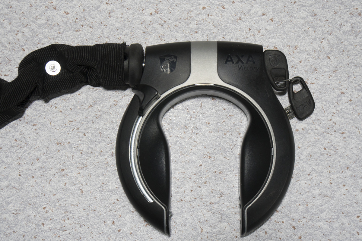 知り合いにあげたAXA VictoryとAXA RLC 140/5,5ですが、クロスバイクを買ってきたのに鍵はVブレーキ用サークル錠と前のママチャリ用のワイヤー錠だけで済ませようとしてたので見るに見かねてさしあげました