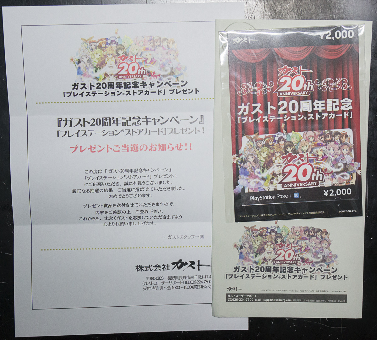 ガスト20周年キャンペーン第2弾のプレイステーションストアカード2000円分が当たりました