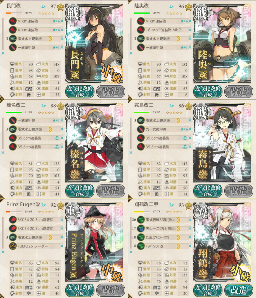 重巡は摩耶かプリンツかそれぞれ試してみたが、制空権確保していない摩耶の対空カットインでは空母を棒立ちに出来ないのでプリンツにした