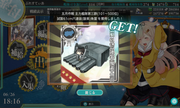 試製61cm六連装(酸素)魚雷は4月の戦果報酬で初登場した装備ですね