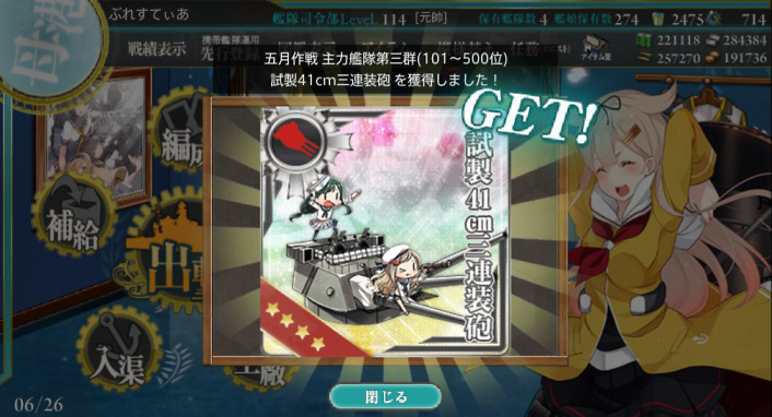 試製46砲は持ってないのでそっちのほうが欲しかったかも。二月戦果報酬での試製35.6砲よりは有り難いですが