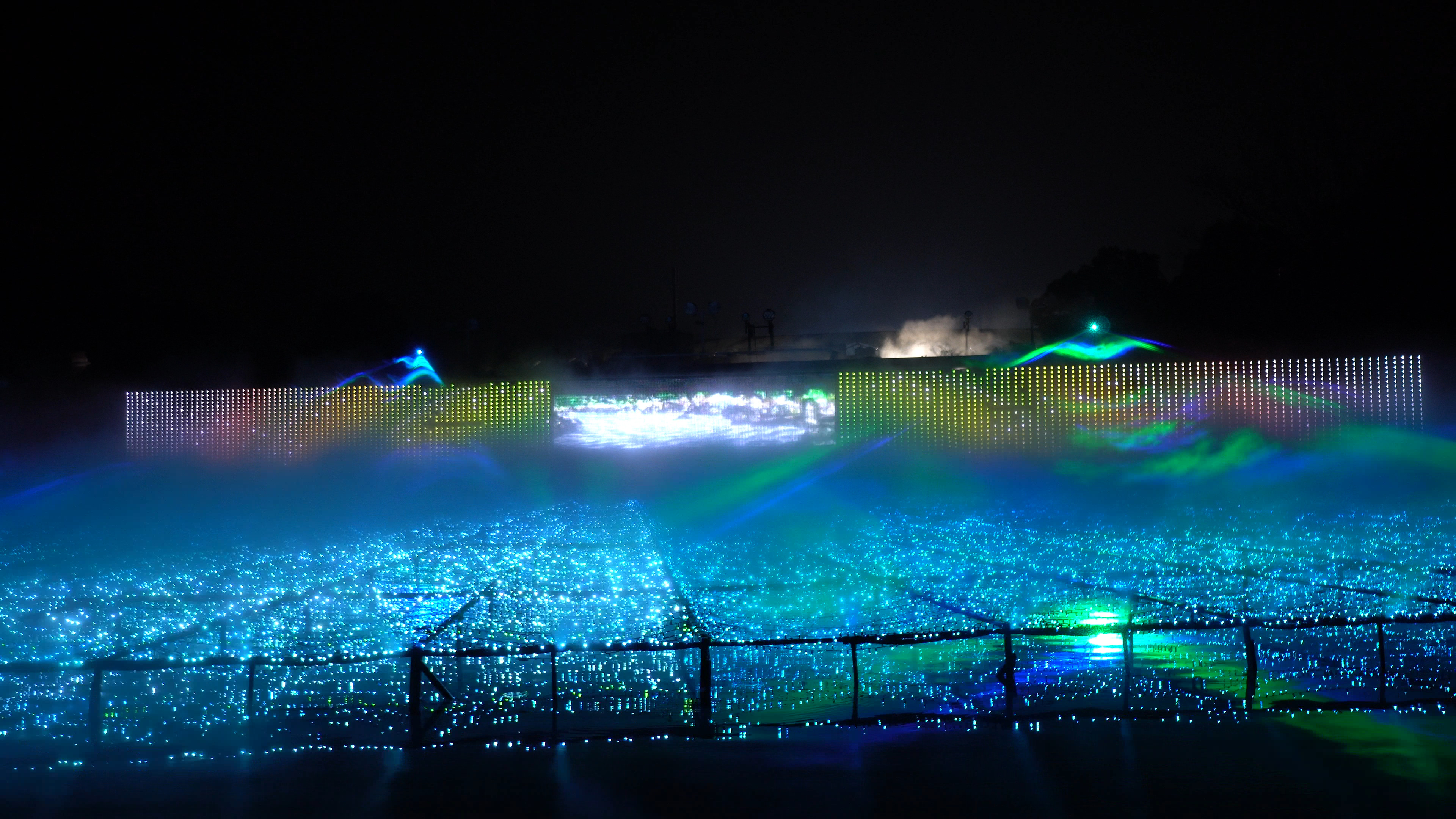 イルミネーションや霧、レーザー、モニター、プロジェクター、滝、波を用いた演目で10分ぐらいやっている