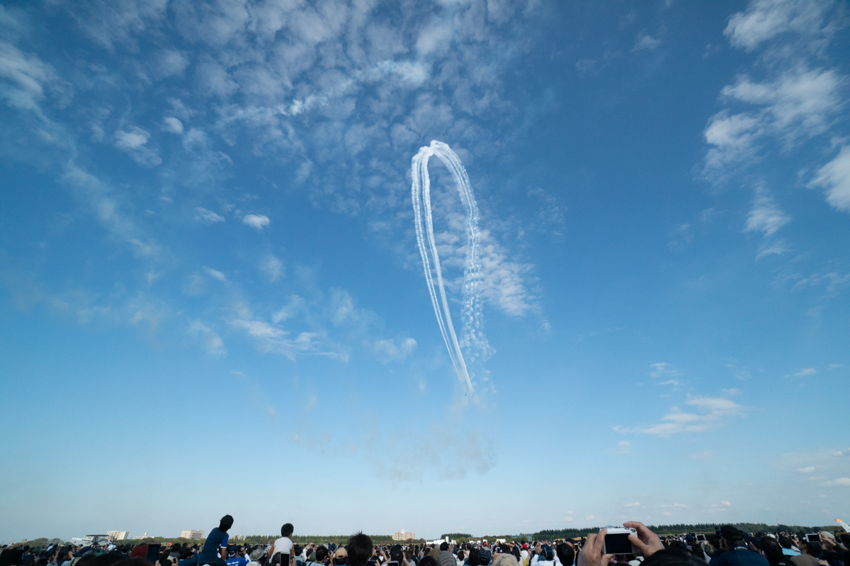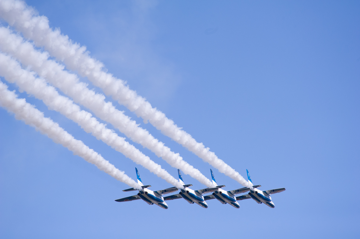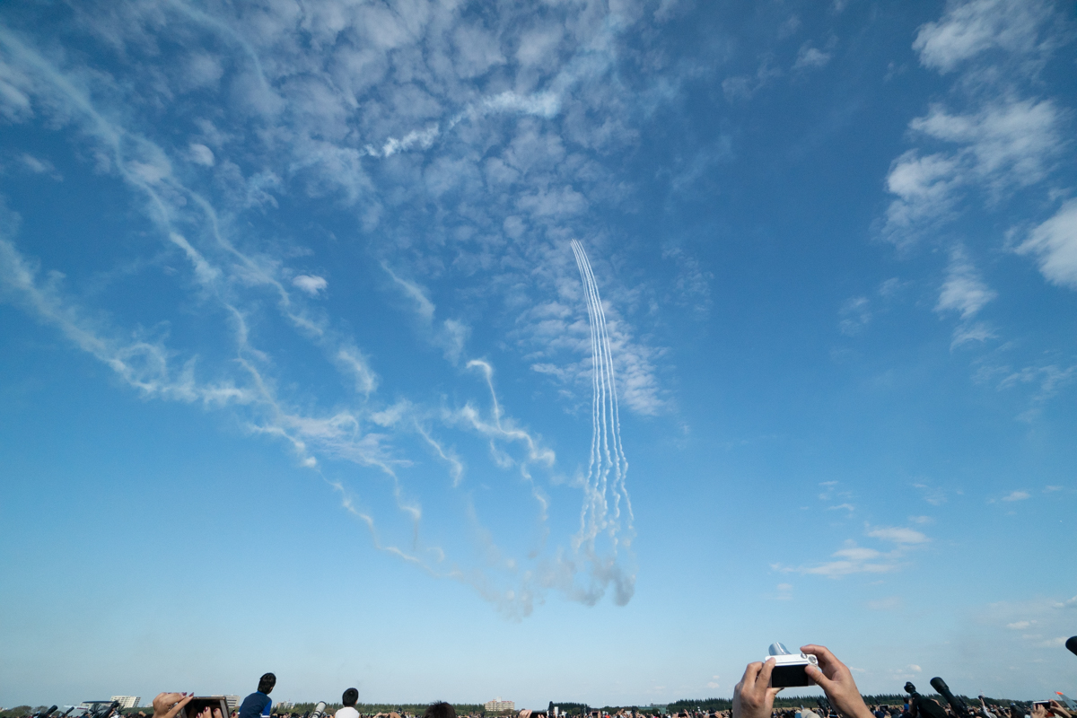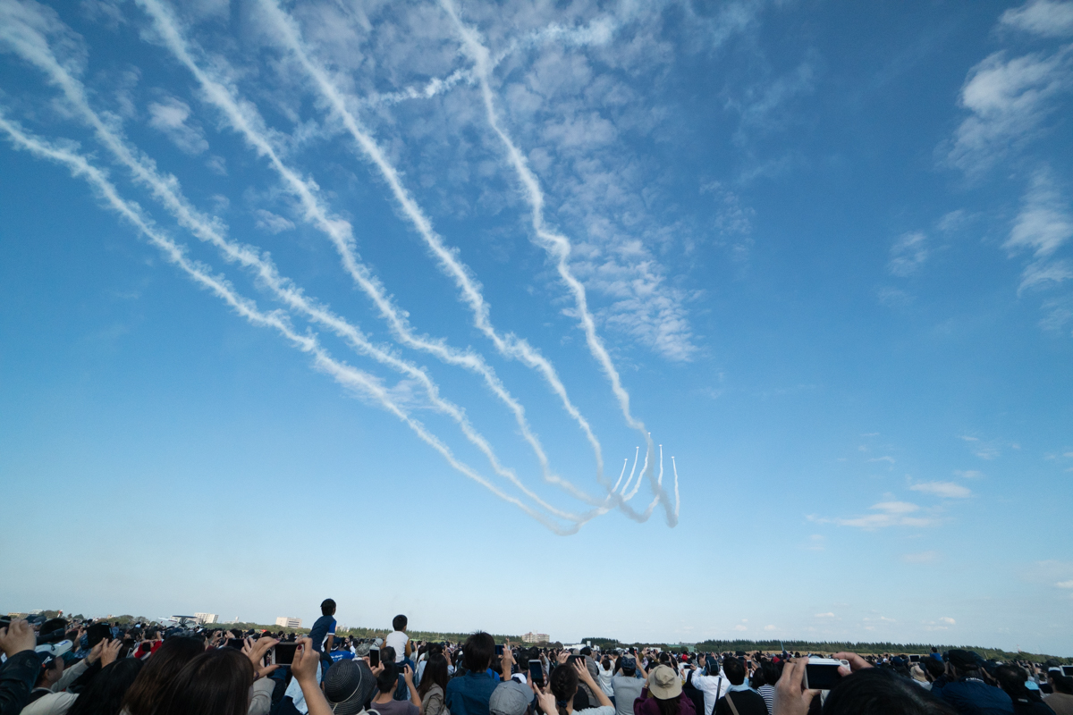 ブルーインパルス飛行では途中で空域に別の飛行機が接近したことで数分の中断と天候不順により五芒星が中止となりました