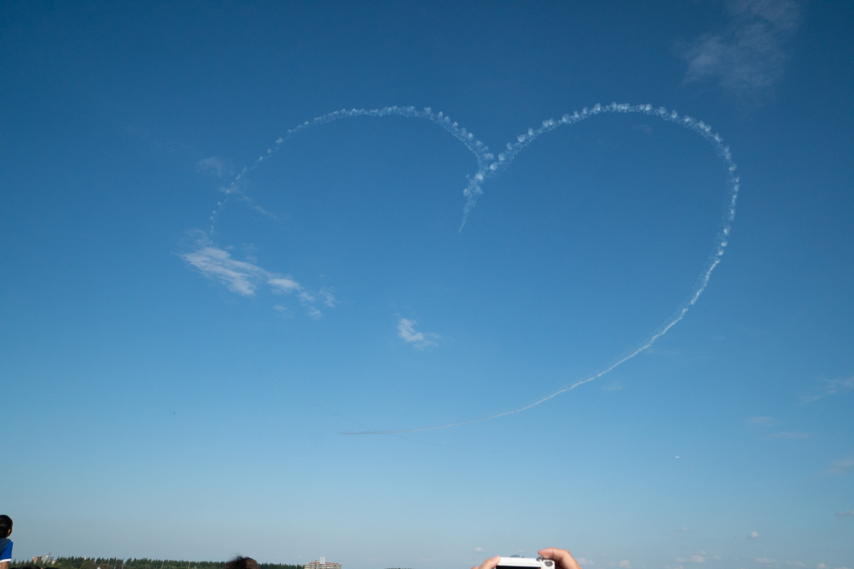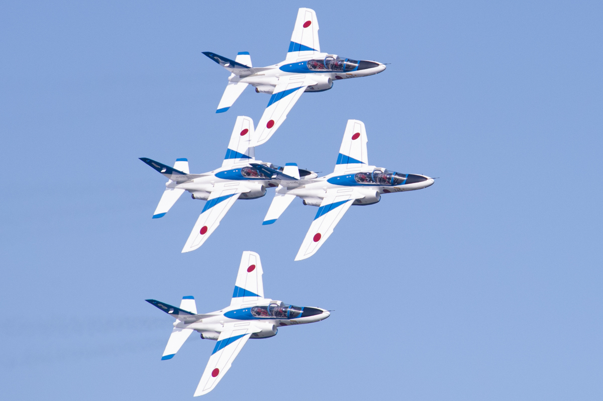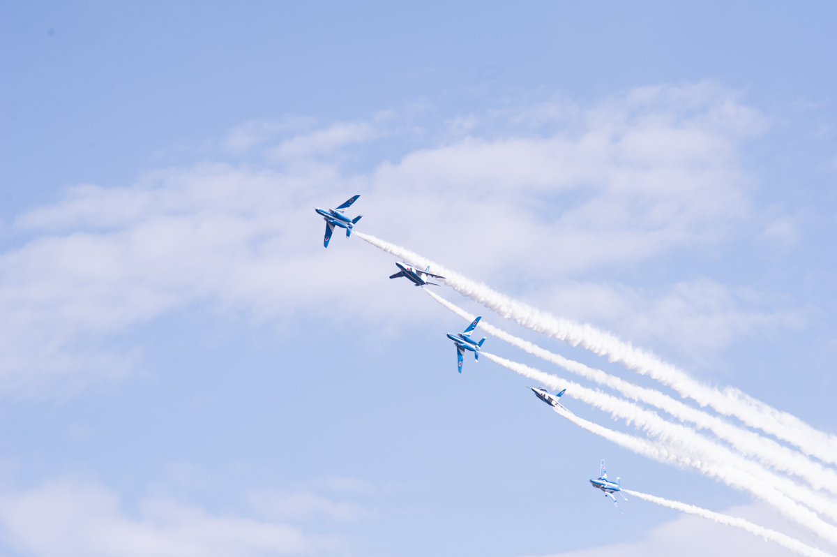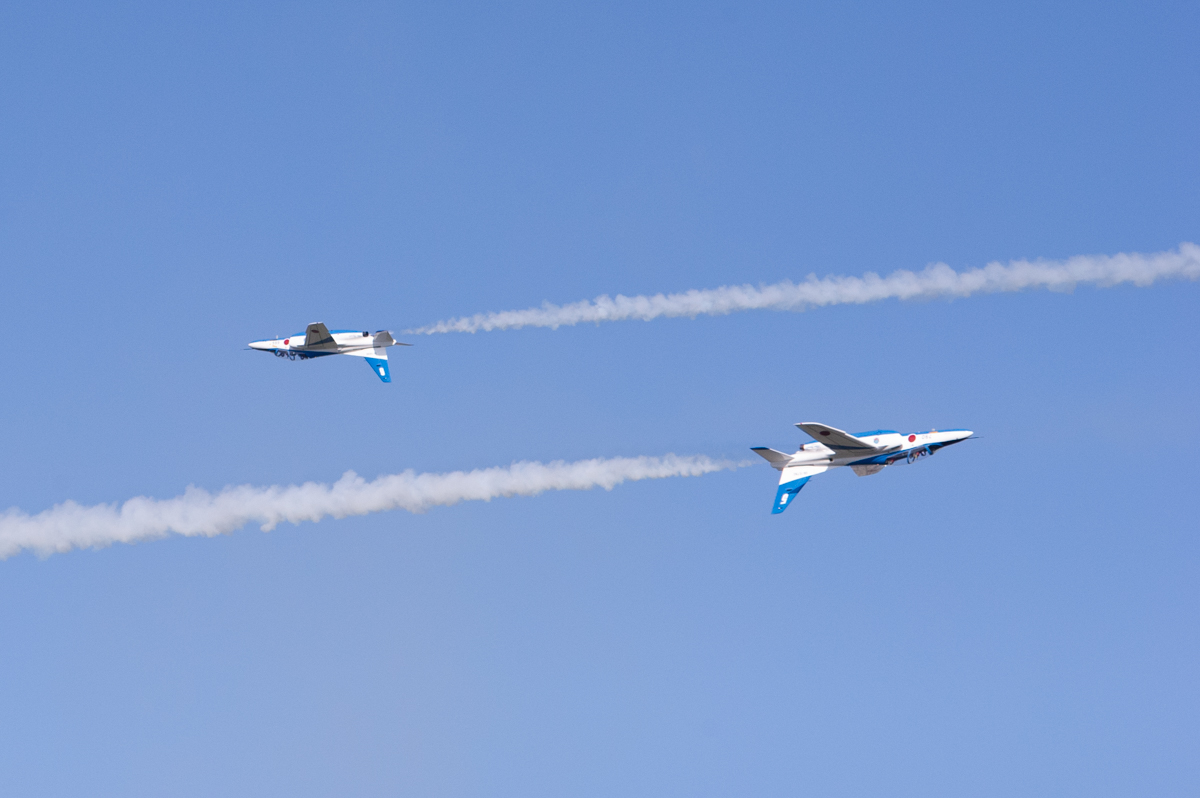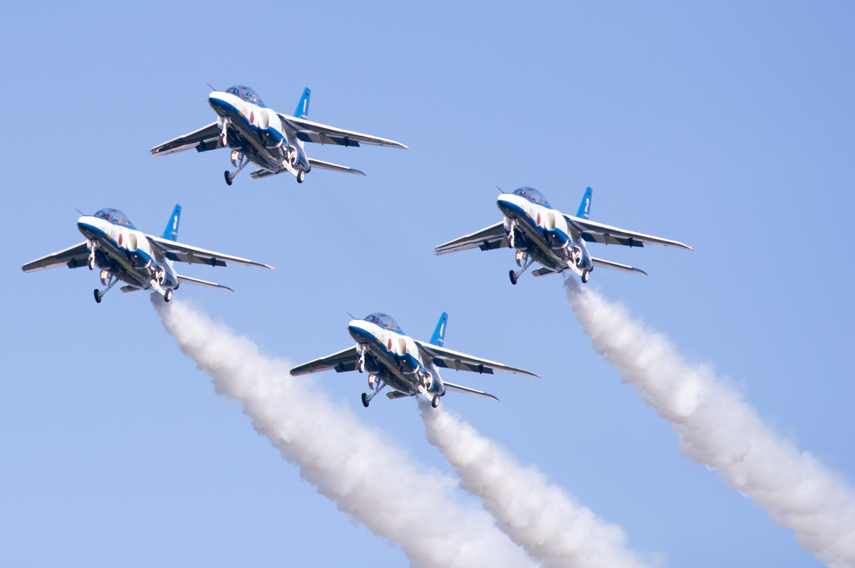ブルーインパルス飛行では途中で空域に別の飛行機が接近したことで数分の中断と天候不順により五芒星が中止となりました