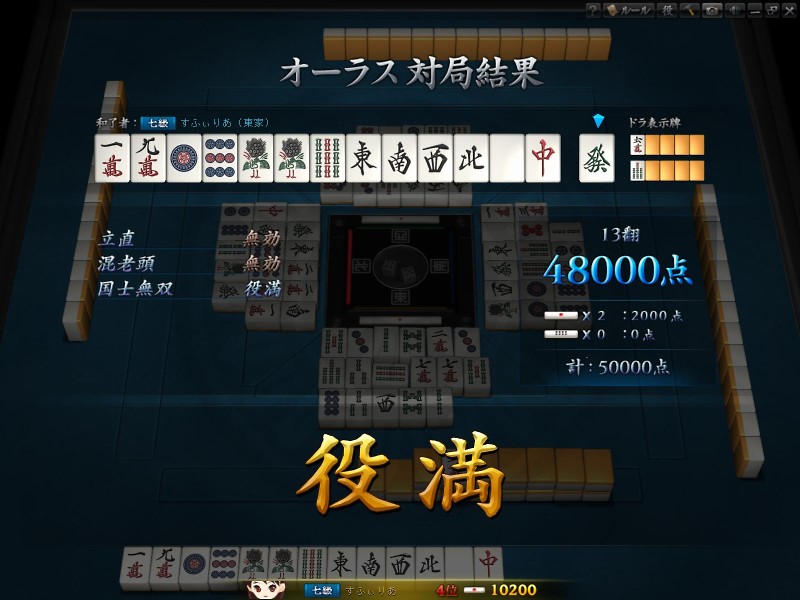 オーラスで10200点で4位から親の役満+1000点棒2本の50000点プラス=60200点で逆転トップ